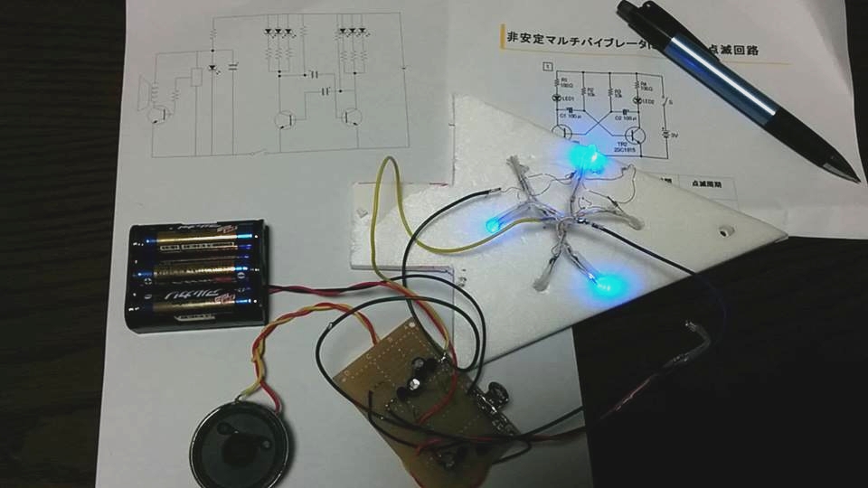 毎年、12月にはボランティアの工作教室でクリスマスツリーを作ってましたが、今年も勤務先の書店で子どもたちとツリーを作りました。今年は、トランジスタ2石の交互点滅回路をつくり、それで青3個、白3個のLEDを交互に点滅させることにしました。LEDはユニットとしてあらかじめ作っておき、回路部分だけを子どもたちに作ってもらいましたが、穴あき基板を使ったのでけっこう大変でした。なお、クリスマスソングのメロディICを組み込んで音が出るようにもしました。